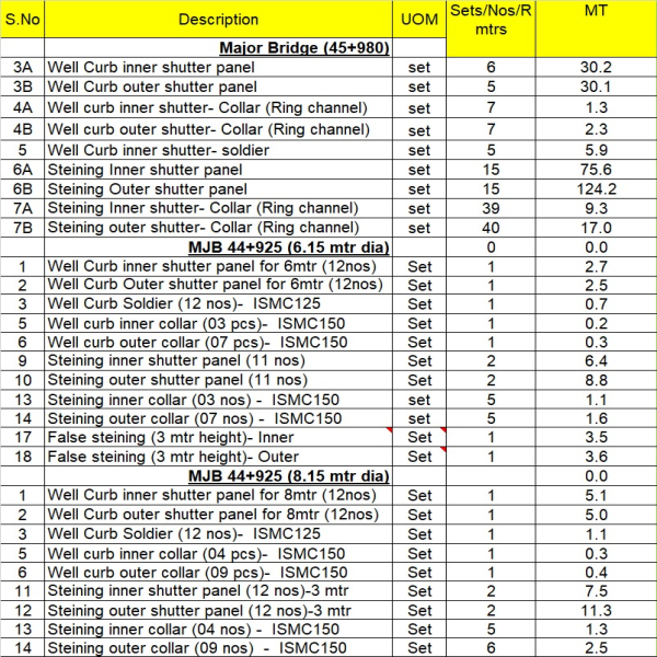 S.NoDescriptionUOMSets/Nos/R mtrsMT